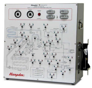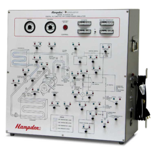 The Hampden Model H-DAACS-CSI Digital Automotive Air Conditioning Simulator demonstrates the principles of operation and troubleshooting of current factory installed AC systems. Hampden H-LTCS Laptop Computer System is included.