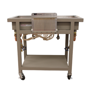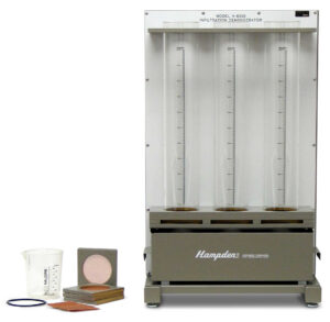 The Hampden Model H-6520 Infiltration Demonstrator investigates the infiltration rates of different soil types and soil surface treatments. This unit consists of a table top base and panel assembly, sump tank tray, three glass cylinders, upper and lower bracket assembly and a graduated beaker. (shown with accessories)