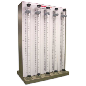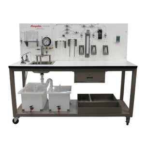 The Hampden Model H-6535 Hydrostatics Bench consists of an assortment of apparatus needed for experiments into the properties of fluids and hydrostatics, including all of the plumbing, pumps and valve control to direct the fluids in the system. Also included is a built-in safety feature that directs fluid into flasks in the case of over-pressurizing the manometers.