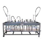 The Hampden Model H-FFFT-5 Fixtures/ Fittings/ Faucets Trainer demonstrates the setup and use of a several lavatory, kitchen, and specialty faucets.