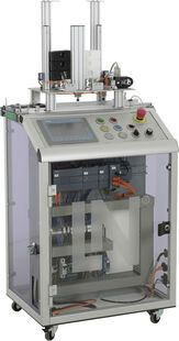 A workpiece carrier is located on the Mechatronic Unit. The carrier is positioned under one of the two shafts for the gravity-feed magazine. The sorting station has two magazines that accommodate six bottom pieces. One piece is selected and placed in the carrier. The carrier and its load are then conveyed to the end of the belt to be passed on to the next sub-system.
