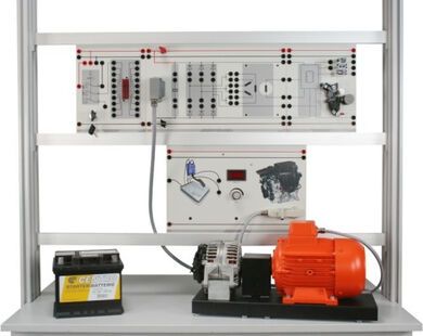 This teaching system is used to study power generation in modern motor vehicles. For a long time, the so-called monolithic controller has been the standard. This component, also called a multifunctional controller, has largely replaced the hybrid controller. Successive experiments introduce the trainee to the topic “Generation of electrical energy in motor vehicles” and describe the structure and function of the controller in detail.